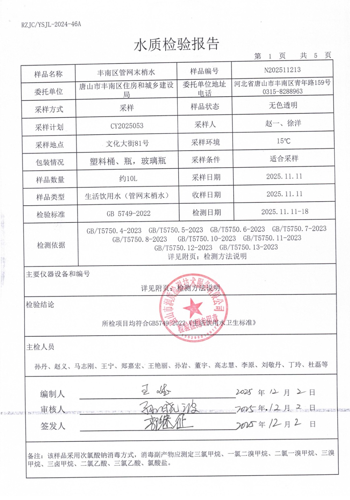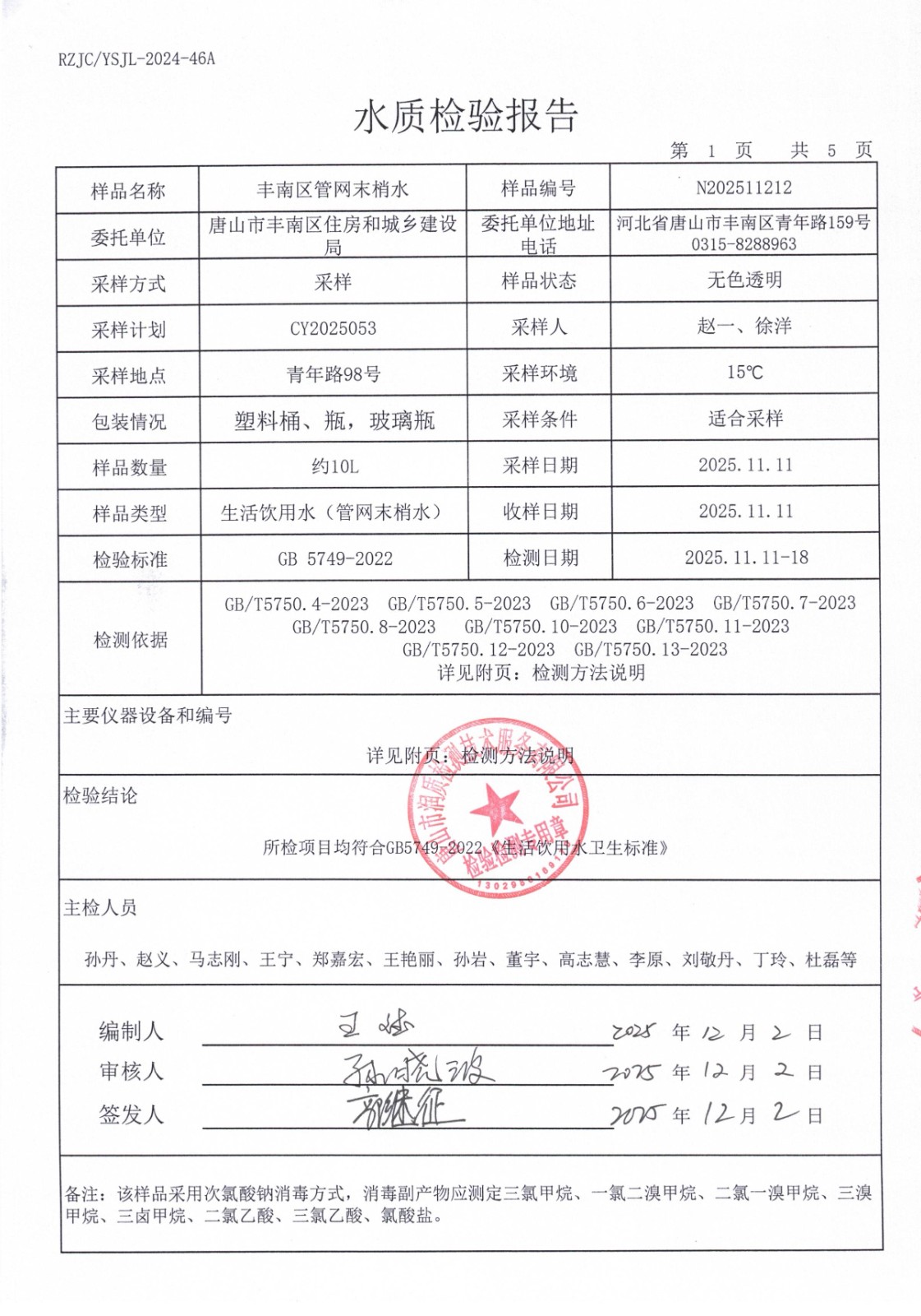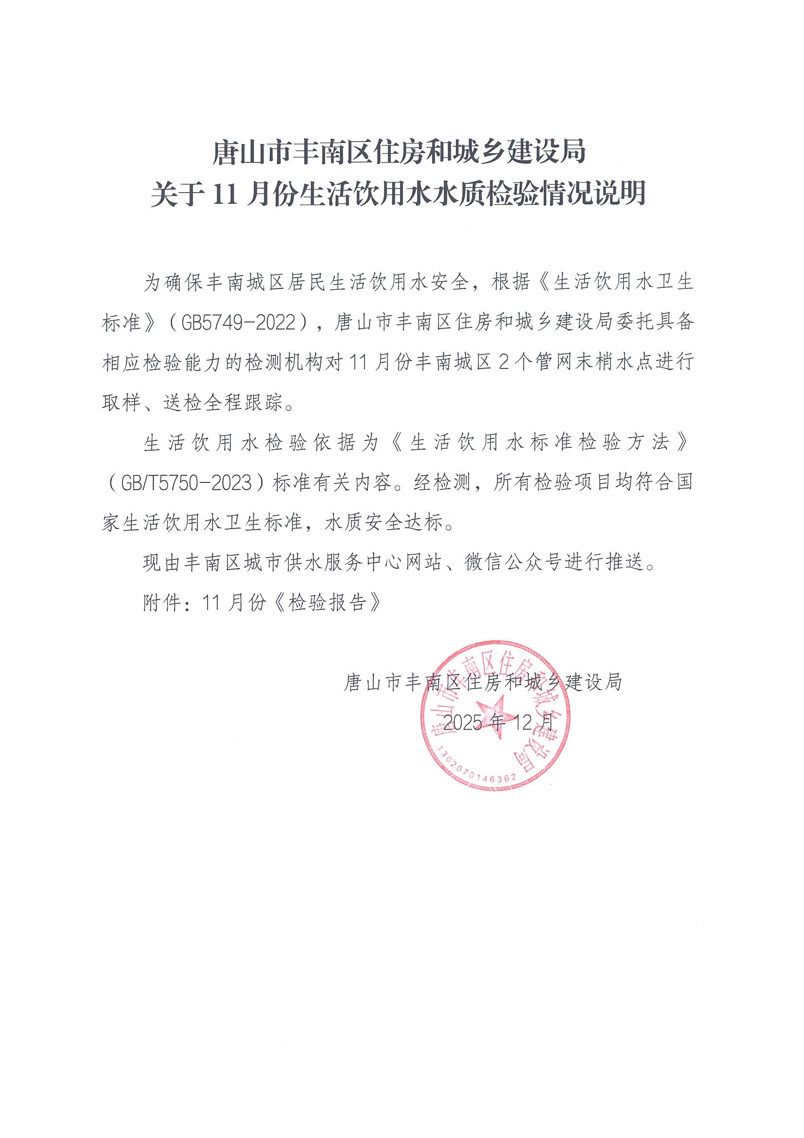 丰南区城市供水服务中心2025年11月份水质报告