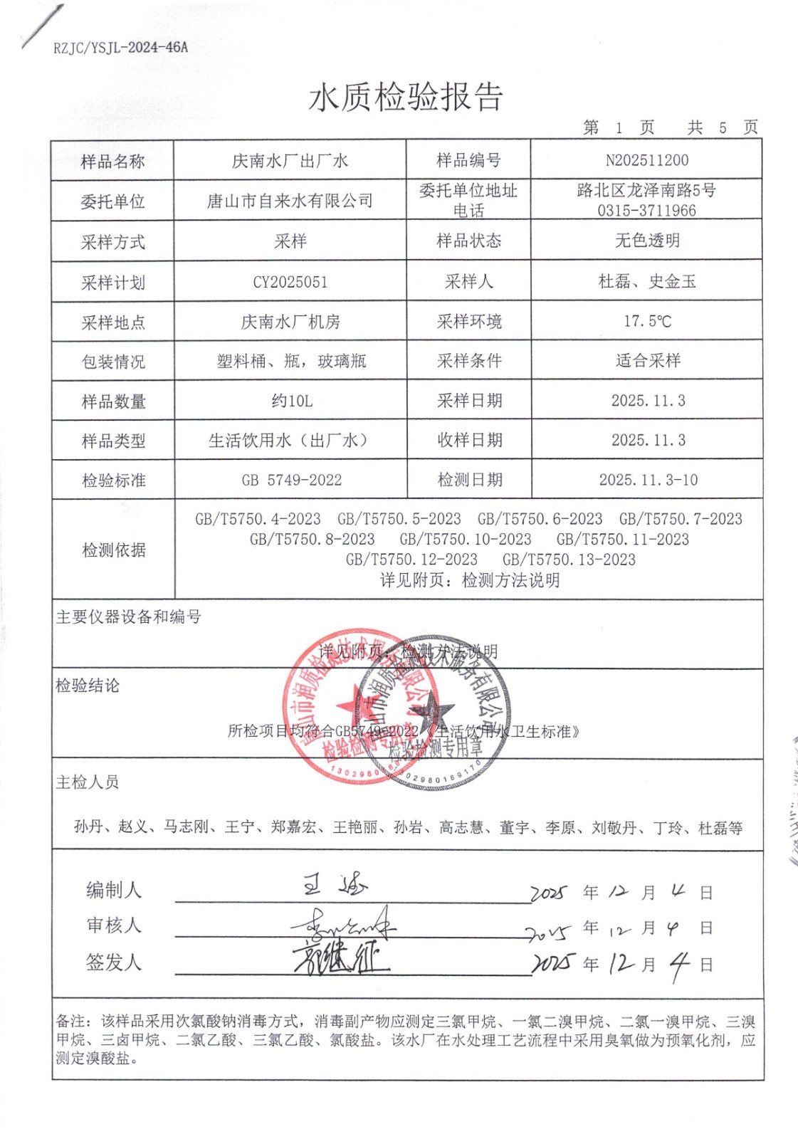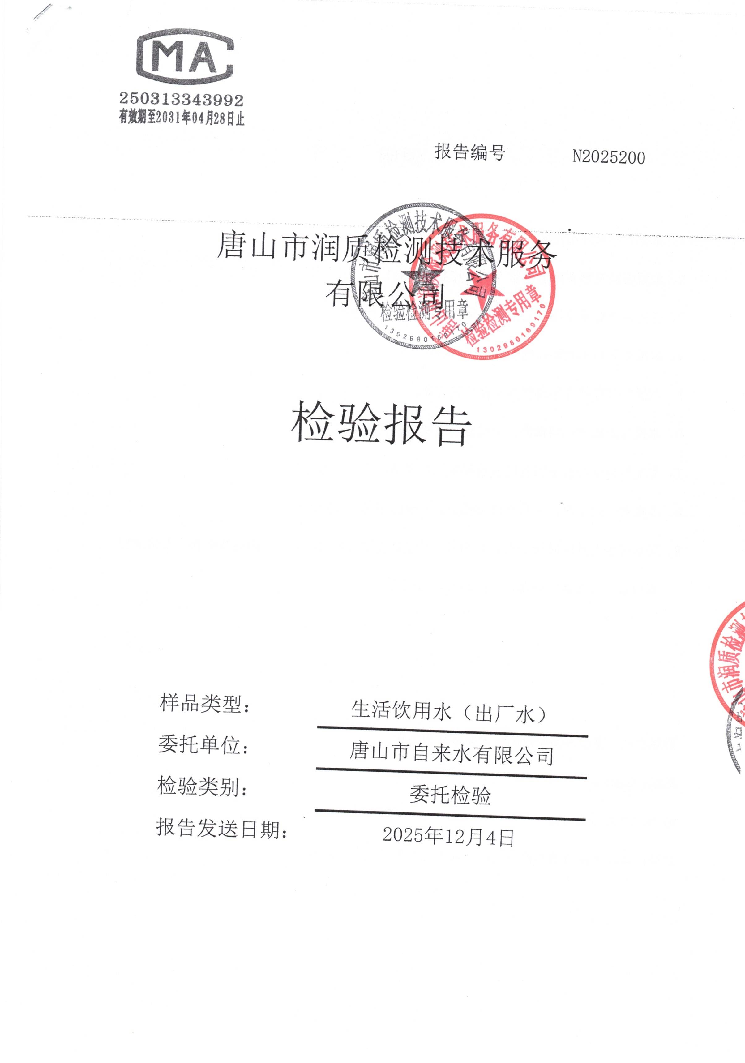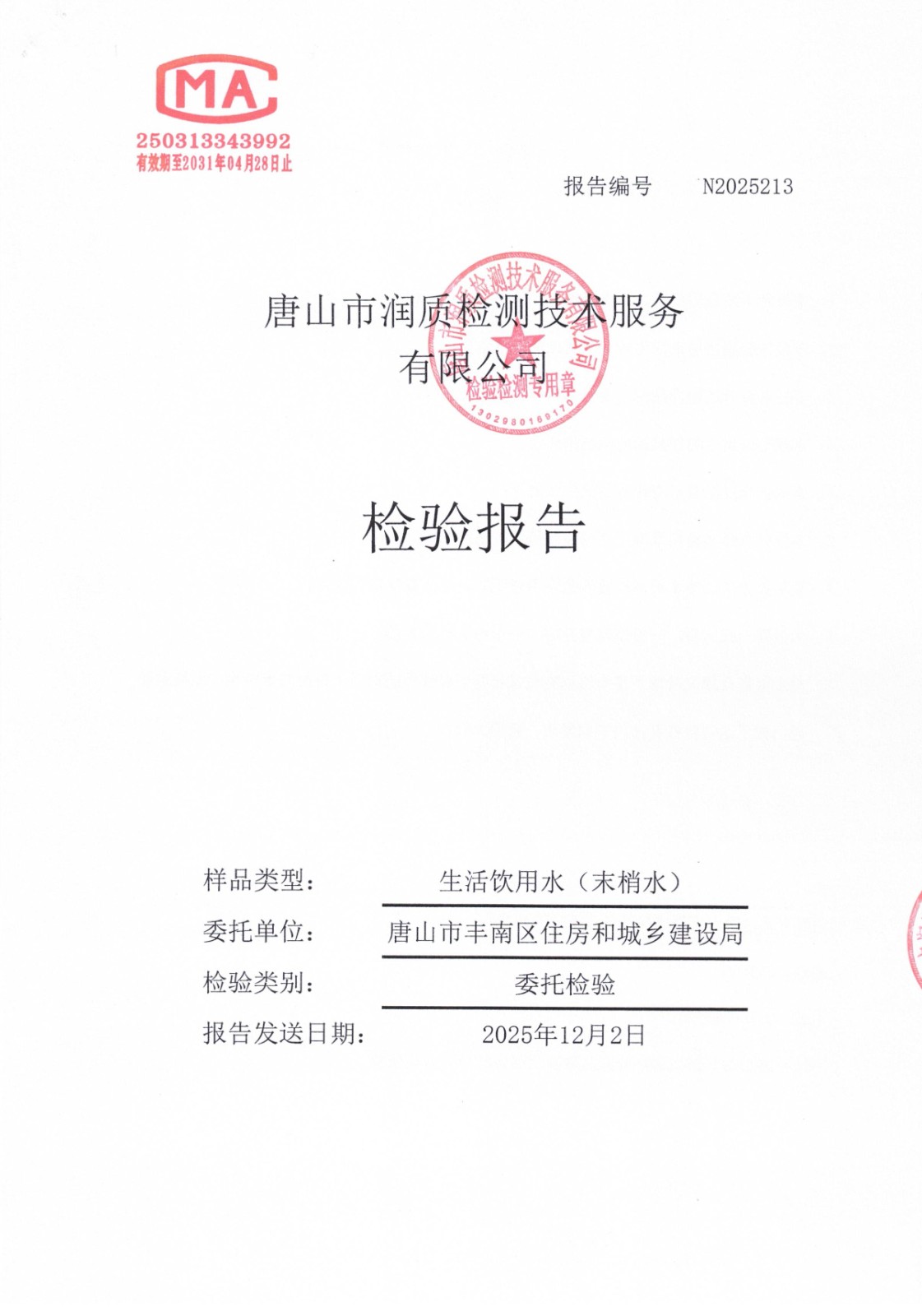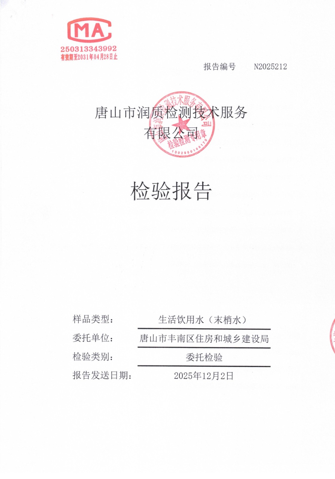 丰南区城市供水服务中心2025年11月份水质报告
